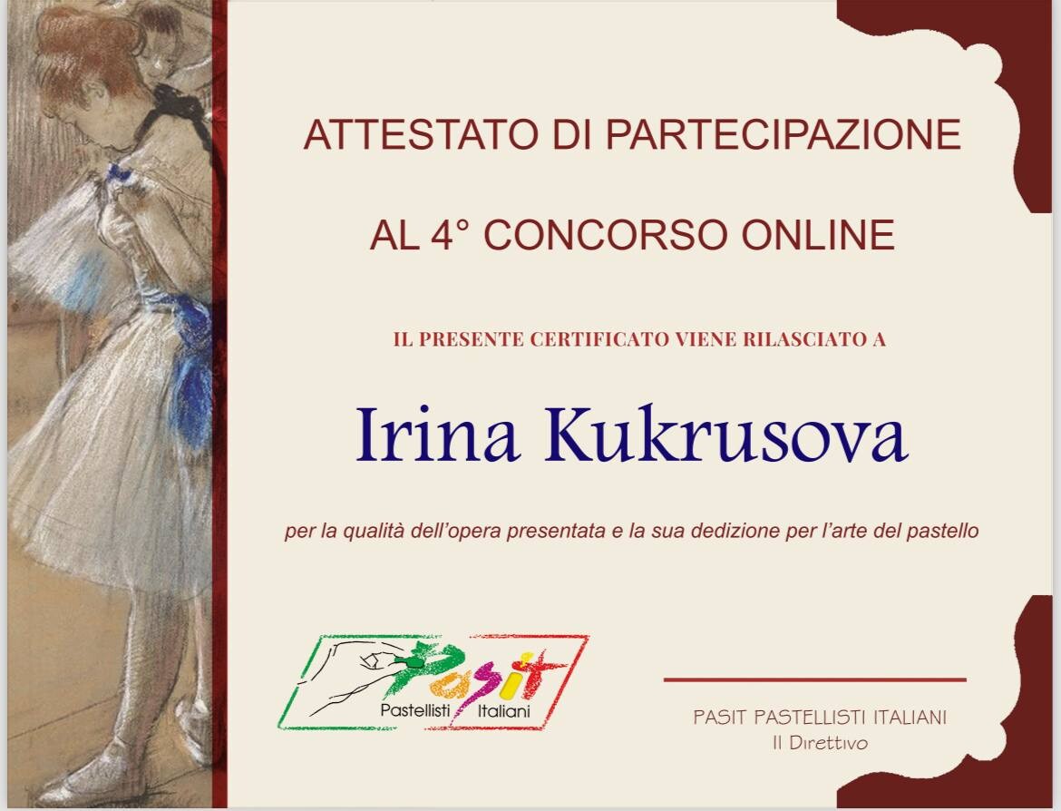 - Призер выставок итальянского пастельного сообщества Pasit в 2024, 2022