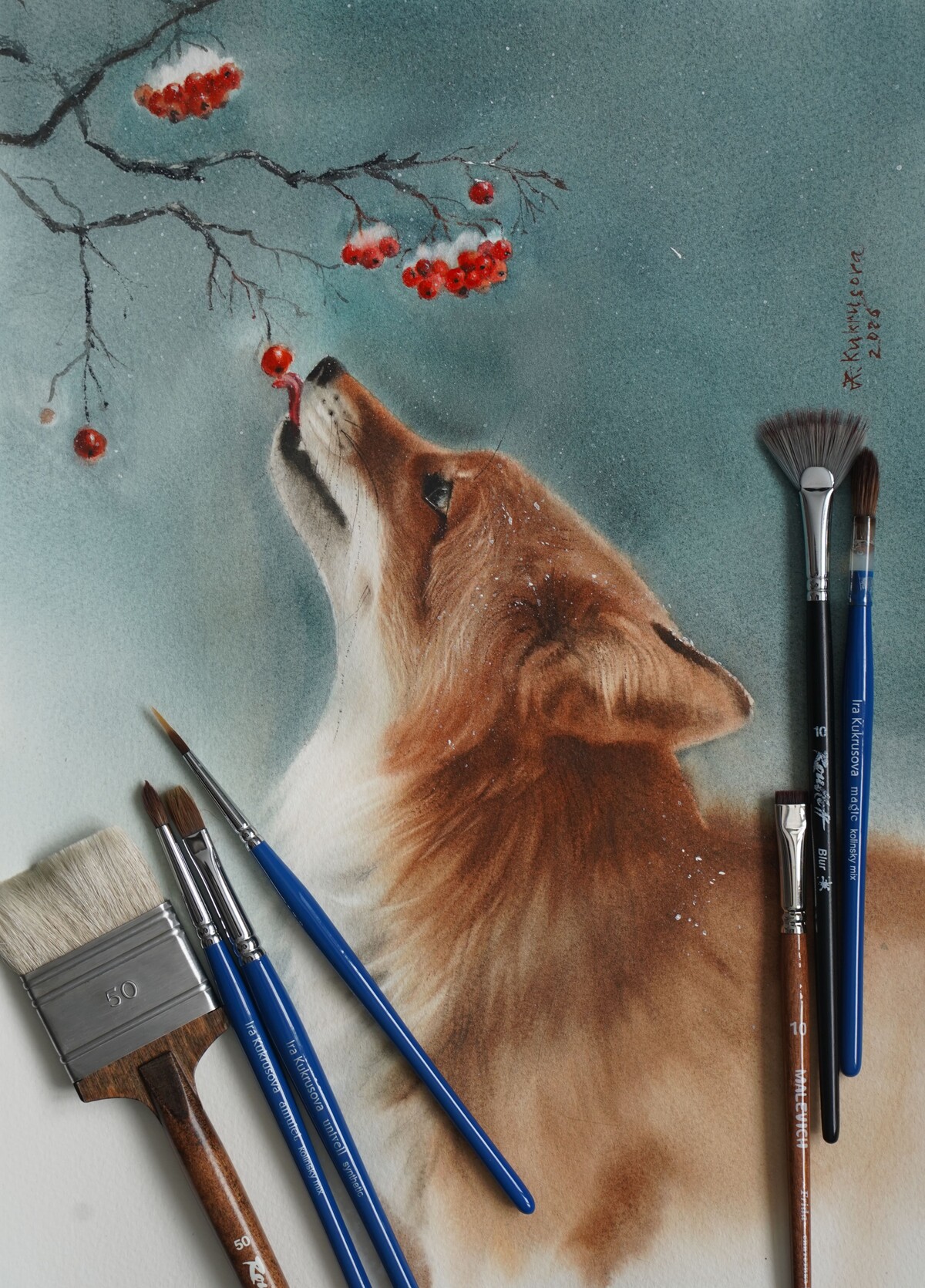 Сюжет прекрасный, а самое главное затрагивает то, что всегда вызывает сложности: как нарисовать шерсть реалистично, особенно контрастную. А лисичка — это пучок контрастных шерстинок. Рисовать белилами светлые шерстинки нельзя!